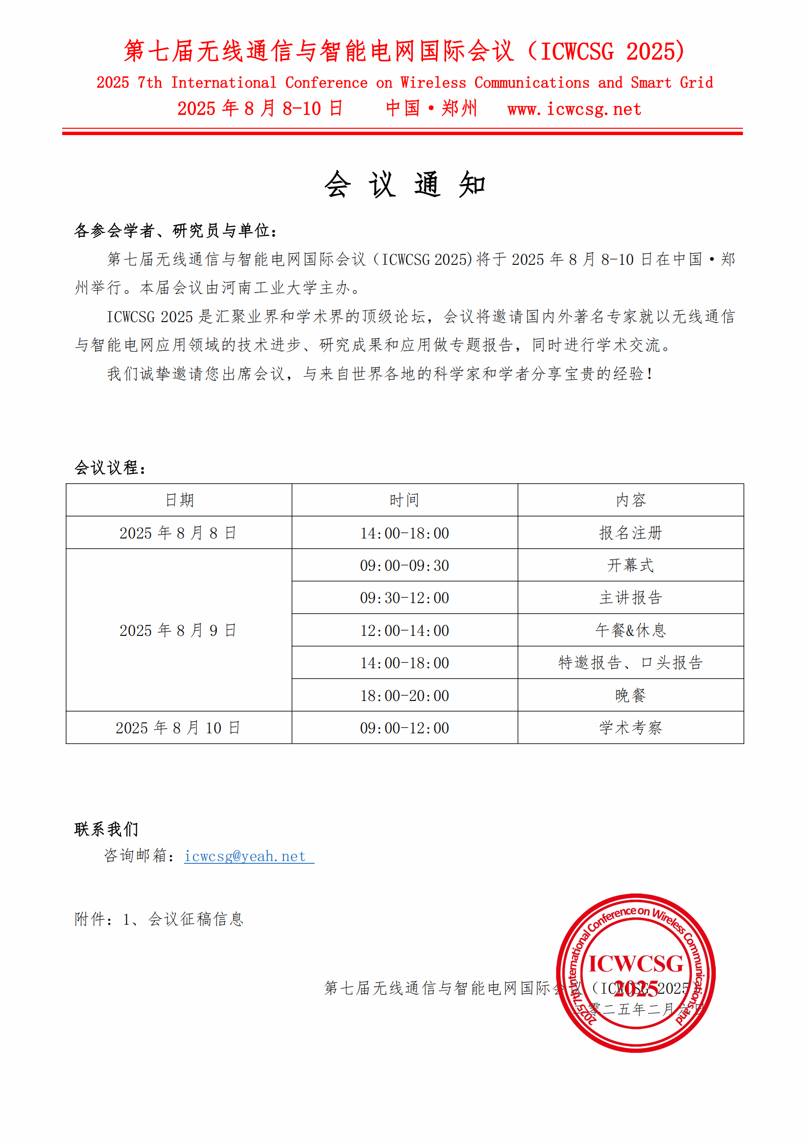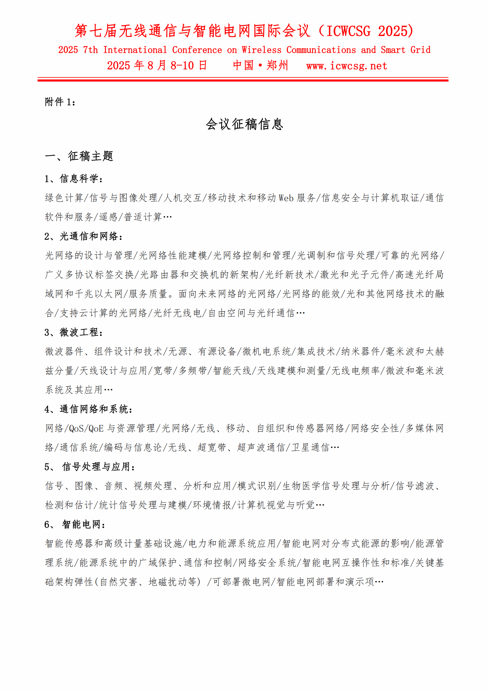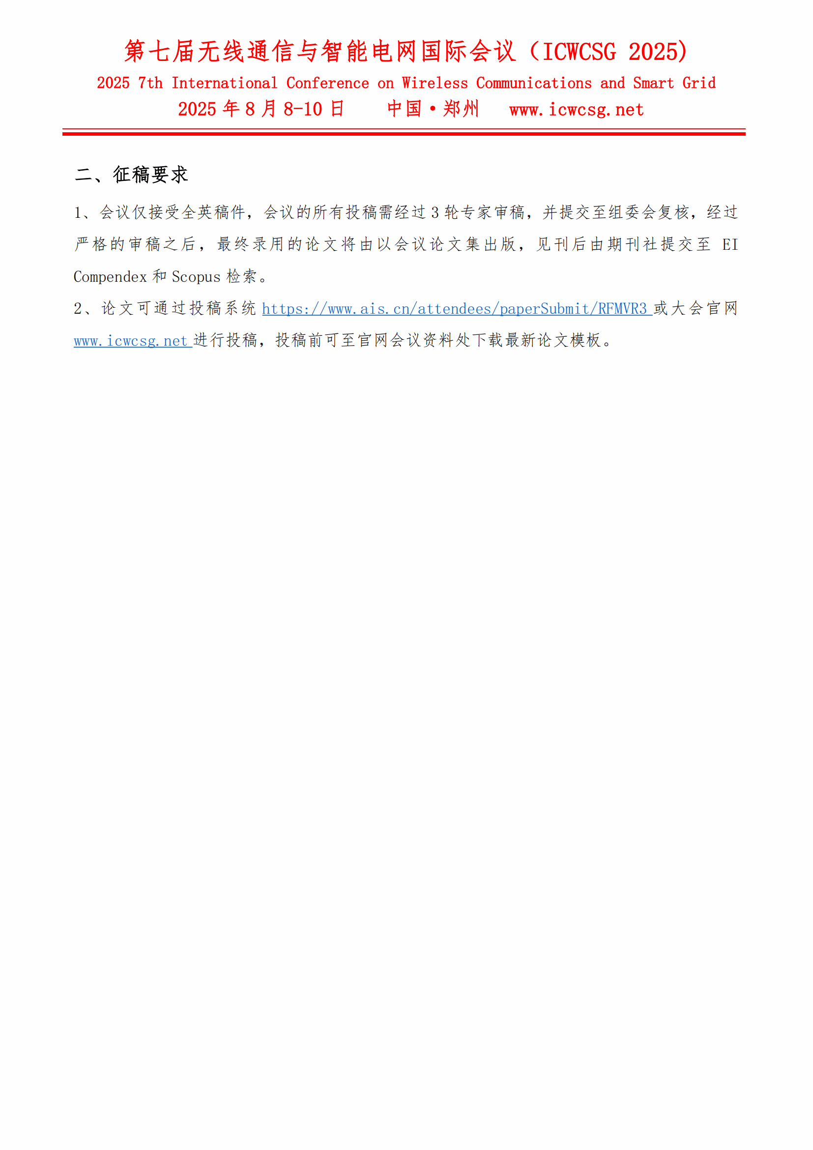 第七届无线通信与智能电网国际会议(ICWCSG 2025)会议通知