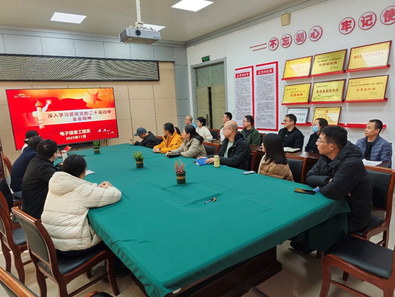 为深入学习贯彻党的二十届四中全会精神,11月25日下午电子信息工程系教工党支部在6412会议室开展“深入学习贯彻党的二十届四中全会精神”专题学习会。会议由党支部书记付麦霞同志主持,电子信息工程系全体教师参加活动。