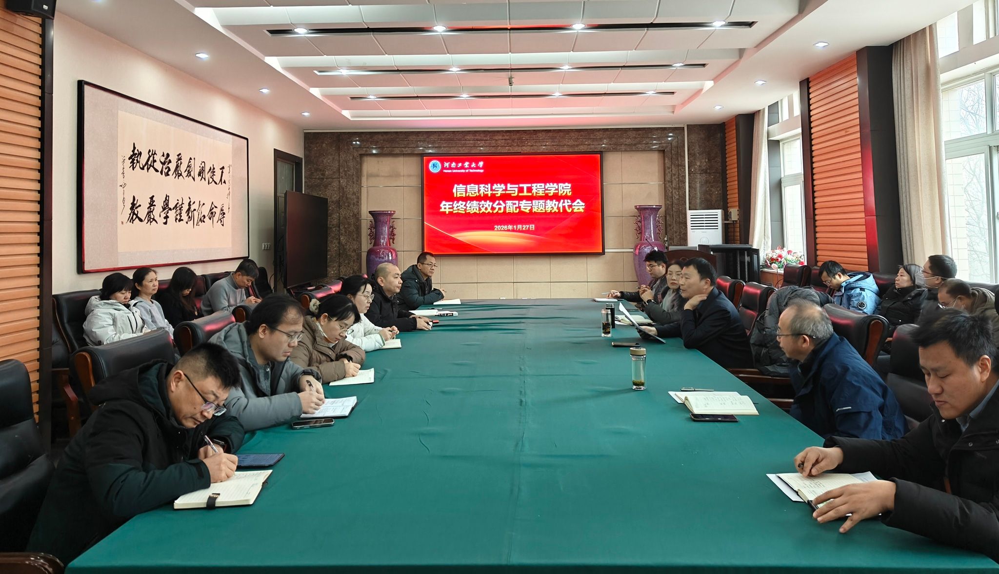 2025年度年终绩效分配方案》。学院领导班子成员和教职工代表参加了会议。学院党委副书记、工会主席魏雪芹主持会议。