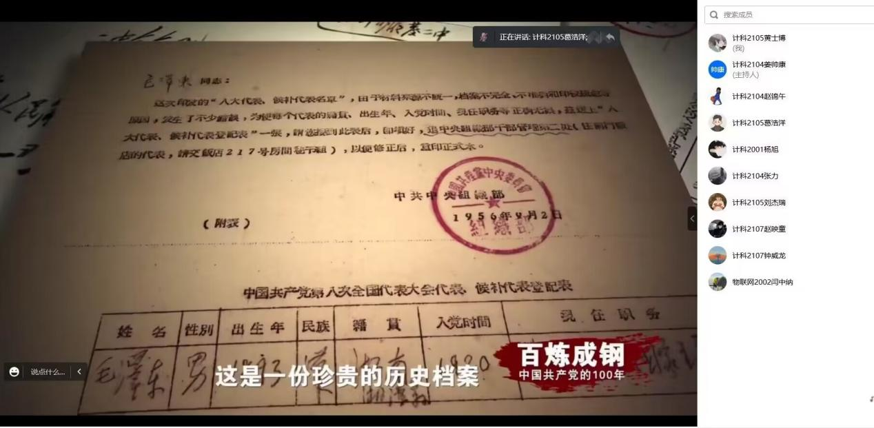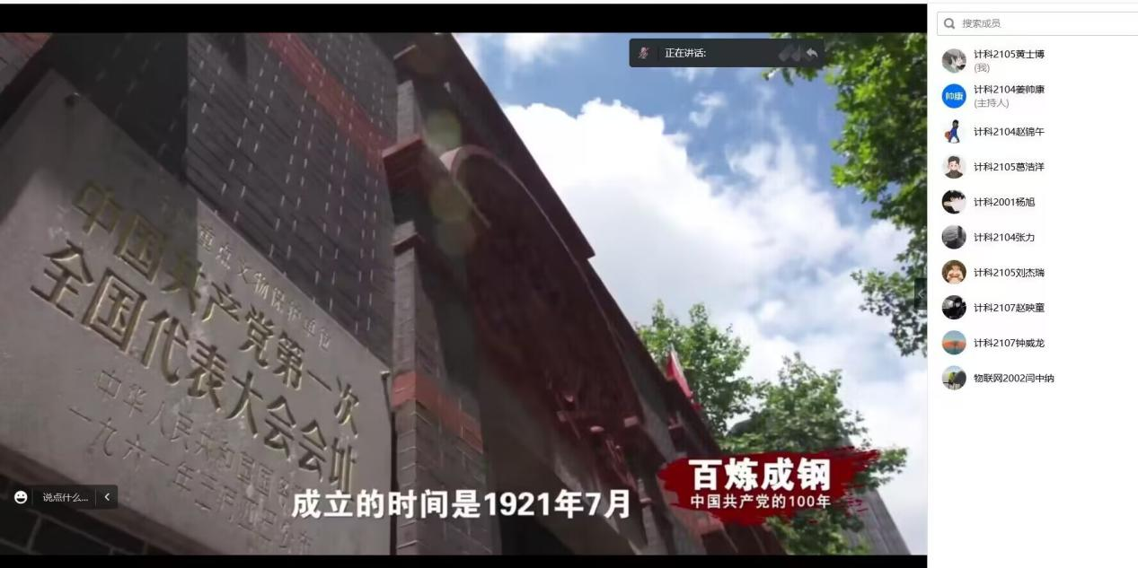 会议开始,组员们首先集体观看了《百炼成钢》纪录片。历史车轮滚滚向前,无情碾碎旧的封建的主义,先进的中国共产党应运而生,她带领中国走过_年的风风雨雨,领导我们越过一个个坎坎坷坷。1921 年 7 月 1 日,中国共产党的诞生,仿如一道曙光划破夜空,在东方闪烁,中国革命史从此翻开了崭新的一页。“弹指一挥间”100 年过去了,旧中国千疮百孔,过去的已成为历史,取而代之的是生机勃勃、一片繁荣的景象。昔日的穷乡僻壤,而今牛羊成群、五谷满仓;昨日的茅檐瓦舍,已被今天的林立高楼所取代,党一直带领着我们昂首阔步向前,劈波斩浪,开辟航向。我们忘不了,改革开放、抗日救国,中国共产党奋战在第一线,人民子弟兵挥泪洒血,保家卫国。我们忘不了,100 年来的建设,改革开放,创新思想,一代又一代新旧党员,兢兢业业,刻苦肯干,是我们经济的支柱。我们忘不了,助人为乐,为民请命,许多优秀共产党员无怨无悔,愿为人民、为共产主义奋斗终身。