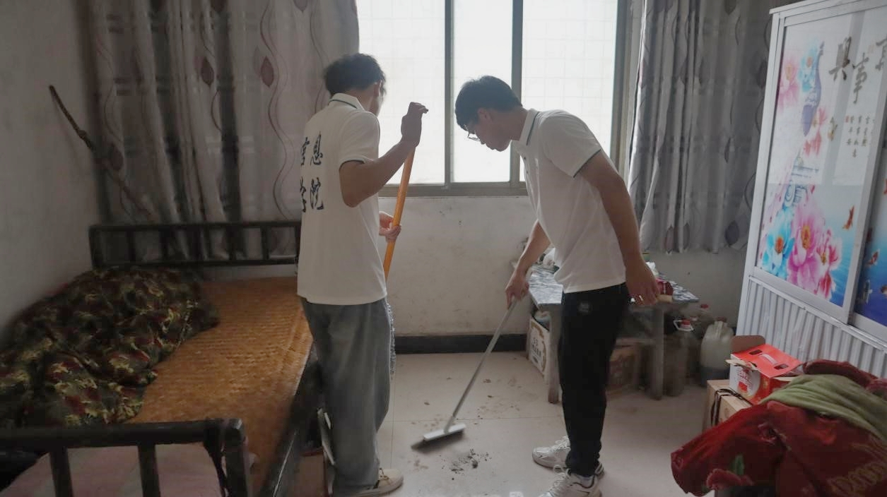 团队成员帮助老人打扫房屋