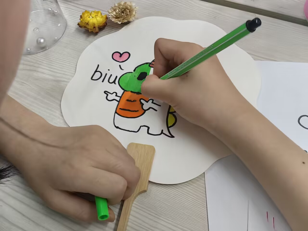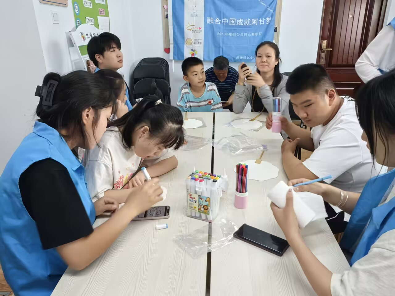 然后志愿者们采用一对一的形式,每个孩子都有一个志愿者帮助他们完成团扇的绘制。志愿者们有的为孩子提供好看的绘制样式,有的帮孩子们绘制线稿,有的鼓励孩子独立完成作品,有的帮孩子粘贴饰品,在整个过程中都有二七汇爱社会工作服务中心的老师们帮忙控场,孩子们绘制完成团扇后,刘仟为孩子们分发零食奖品。