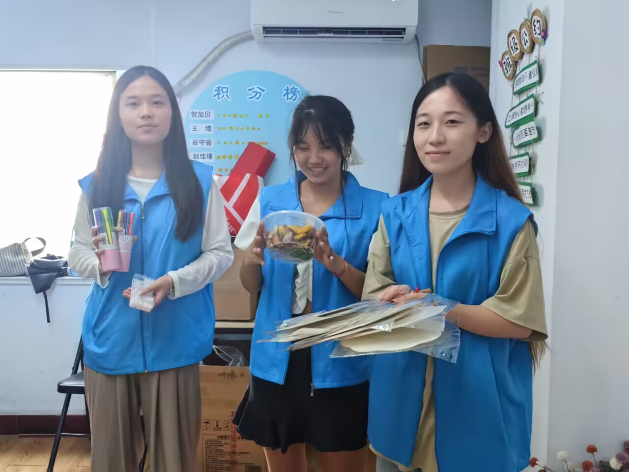 在这次活动的最后,志愿者和孩子们一同展示了完成的作品,每个孩子都富有创造力,活动圆满完成,实践团队的成员拿出院旗与孩子们合照。