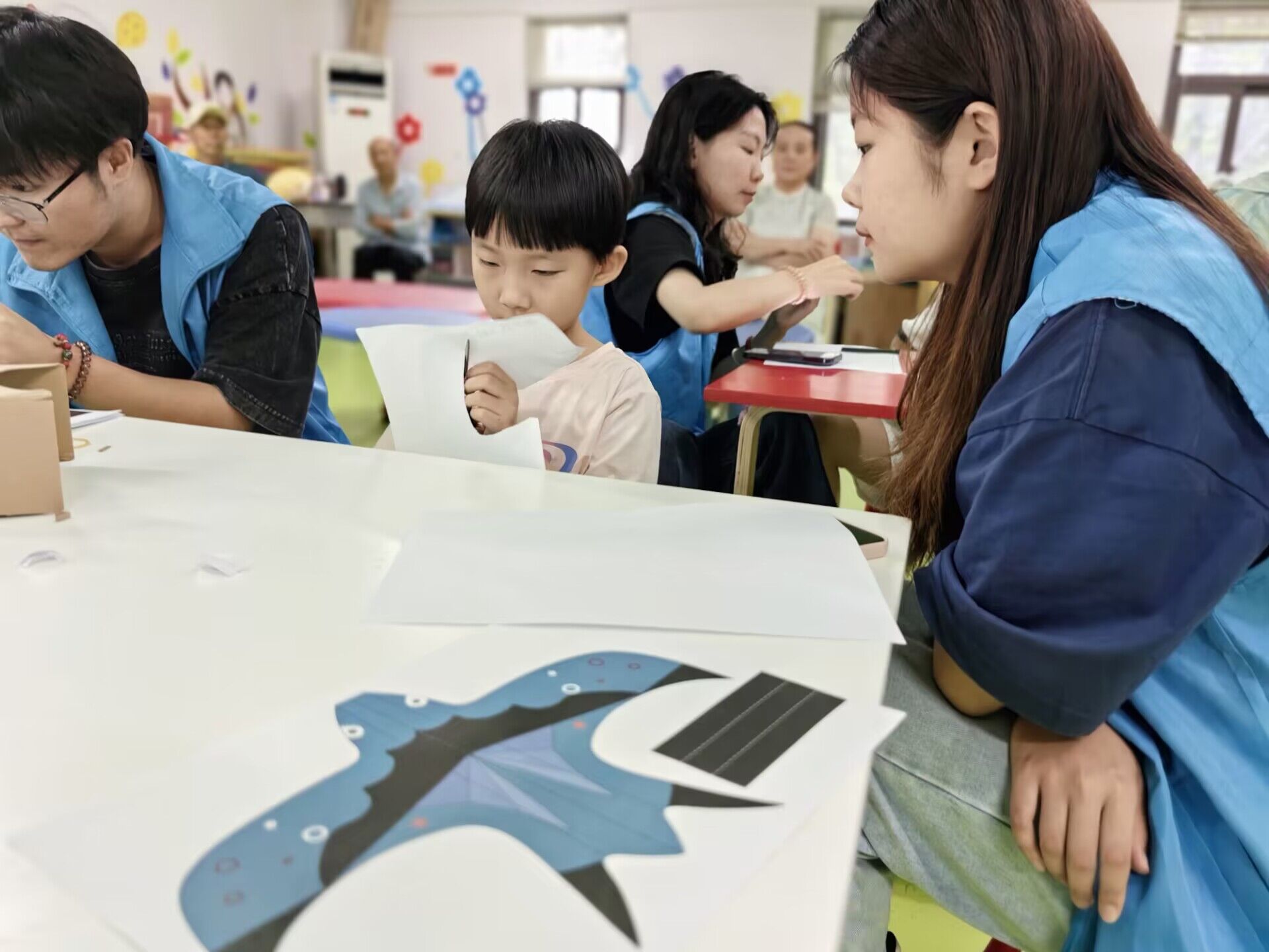 随后,队员们为孩子们分发了制作燕子纸飞机所需的材料,并在志愿者们的帮助下,孩子们成功地亲手制作出一架漂亮的燕子纸飞机。