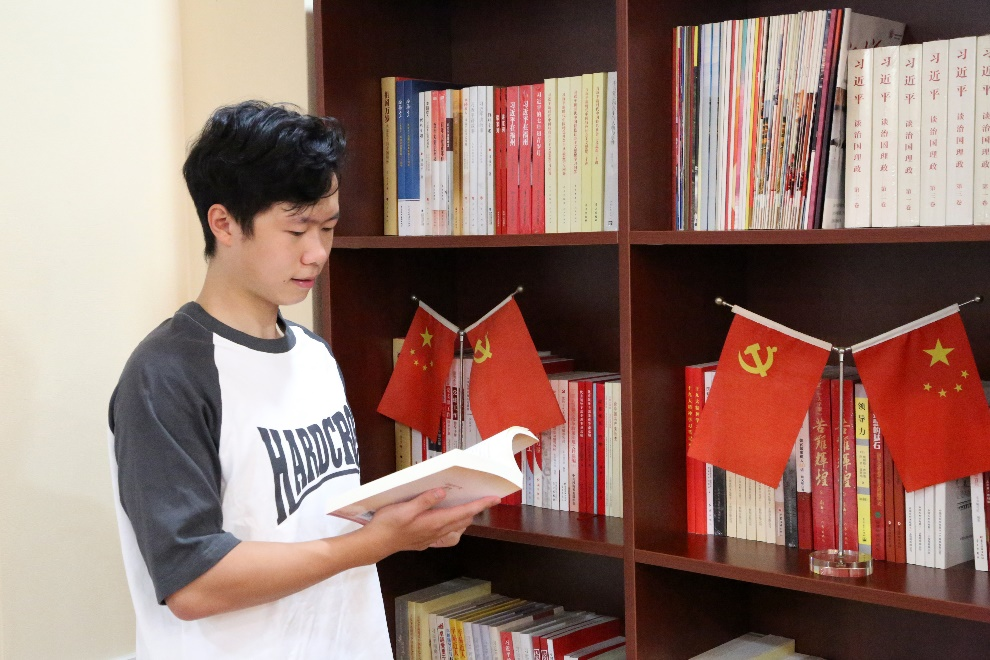 图二 队员郝意洋在河南省荥阳市党建主题公园翻阅书籍学习党史