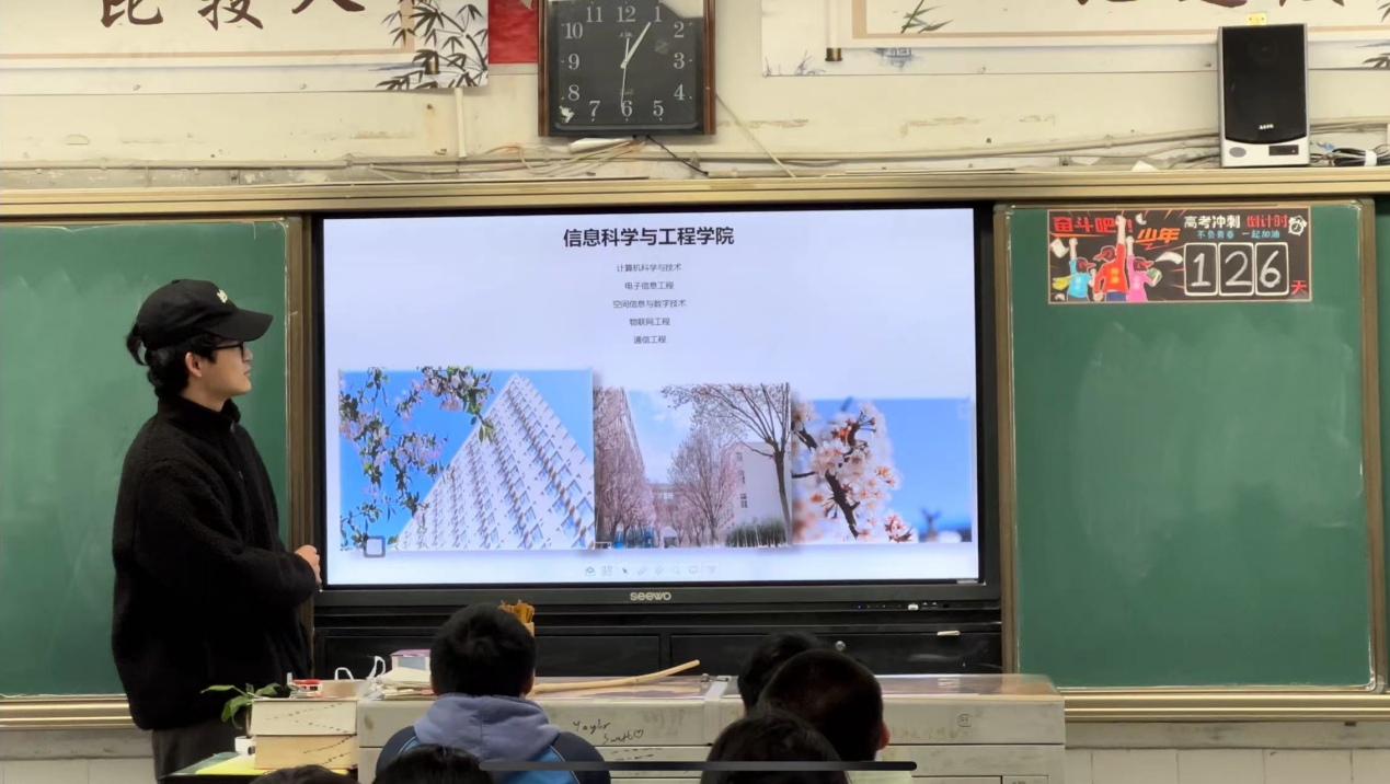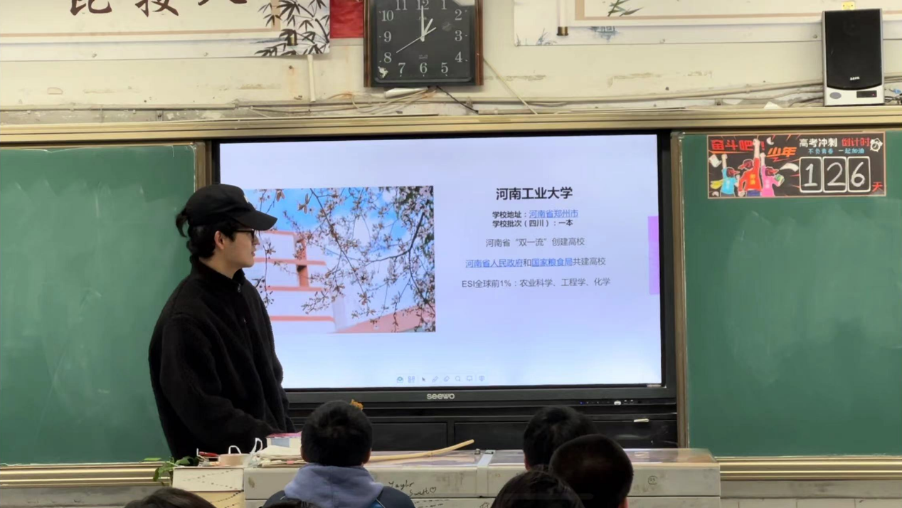 为例向自贡市第一中学校的高三三班学子介绍大学的校园生活,给予了他们拼搏高考的动力,同时也充分体现了我校学子朝气蓬勃的精神风貌,展示了我校的实力强劲,为学校招生宣传作出了一份贡献。