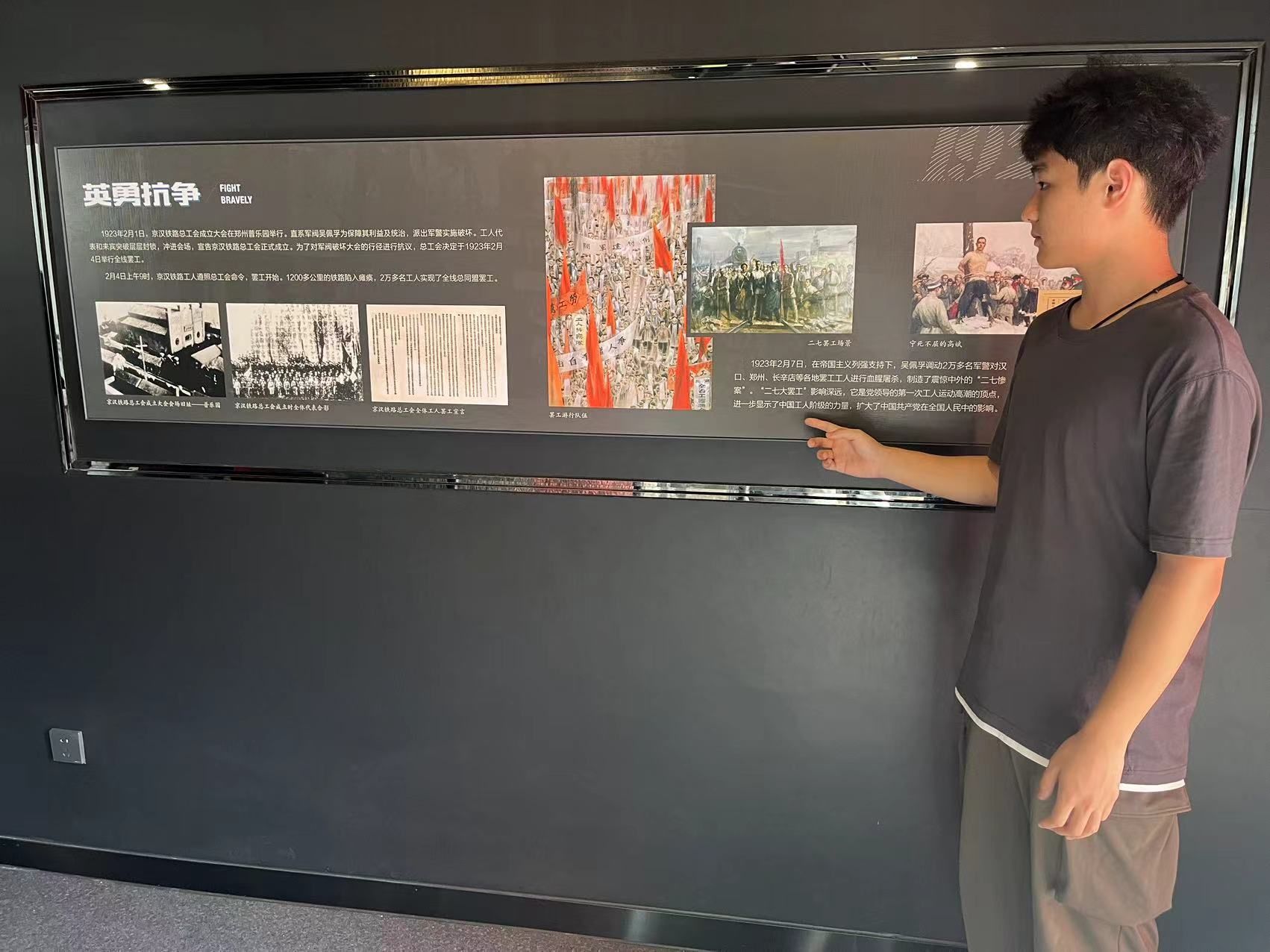 二七纪念塔共14层,其中塔基座为3层,塔身为11层。沿着大理石台阶往上走,进入展厅,墙壁上刻着铁路工人的浮雕,旁边摆放着参观指引目录。再往上,每层一个展厅,共八个展厅,八个主题:京汉铁路的修建与早期工人运动、京汉铁路总工会的成立、京汉铁路工人大罢工、工人运动的恢复和再遭摧残、永恒的纪念、二七塔今昔、城市记忆、继往开来。实践队依次进行参观。每个展厅内都陈列有"二七"大罢工的各种历史文物、图片、文字资料,由此实践队也可以更加清晰地了解到革命先烈们的光辉事迹。