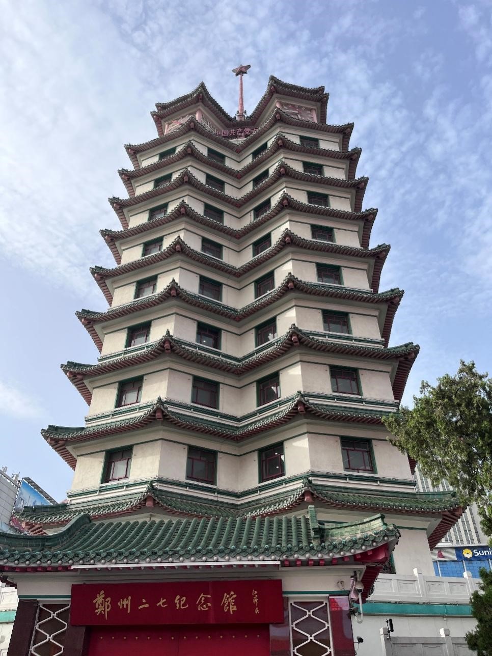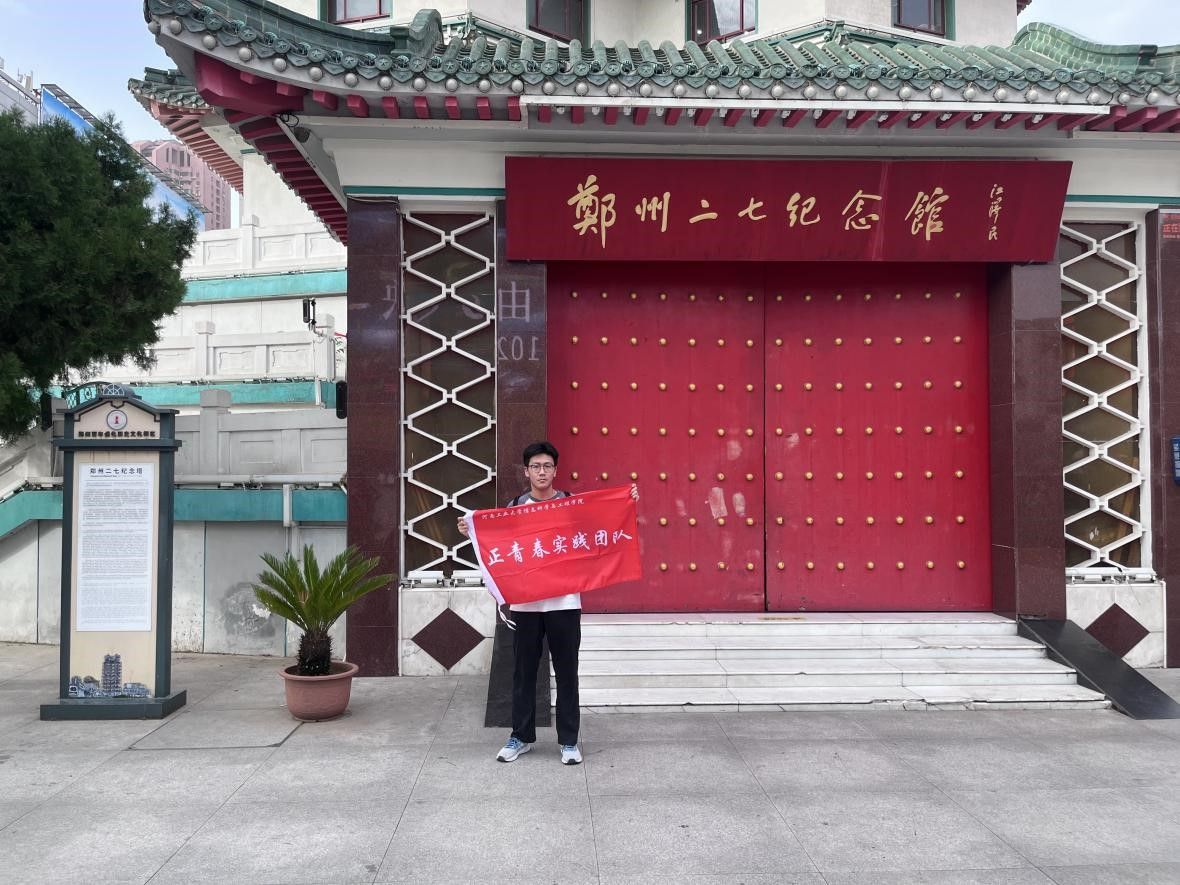 正青春实践团队的黄呈栋同学在二七纪念塔前开始,怀着崇敬的心情,开始了我们的历史之旅。二七纪念塔是为纪念1923年京汉铁路工人大罢工而建,塔高63米,巍然屹立在郑州市中心,是中国工人运动史上重要的纪念建筑之一。黄呈栋同学在讲解员的引导下,逐层参观了纪念塔内的展览,详细了解了二七大罢工的起因、经过及其历史意义。