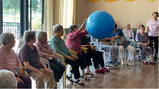 当天上午,成员们分组与养老院的老人们一起参与了康复游戏活动。在宽敞的活动室内,老人们围坐成一圈,与团队成员们相互配合。大球在大家的手中传递,笑声与加油声此起彼伏。这个游戏不仅锻炼了老人们的反应能力和身体协调性,更增进了彼此之间的情感交流。张奶奶虽然动作略显迟缓,但在团队成员的鼓励下,始终积极参与,脸上洋溢着开心的笑容。