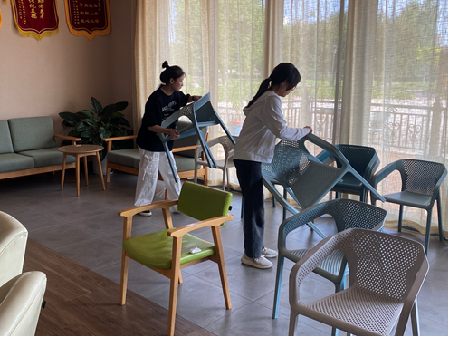 与此同时,另一部分团队成员则专注地帮助整理活动场所。他们齐心协力,将散乱的椅子摆放得整整齐齐,为老人们的日常活动提供了更加便利和舒适的环境。每一把椅子的归位,都凝聚着团队成员们的细心与关爱。