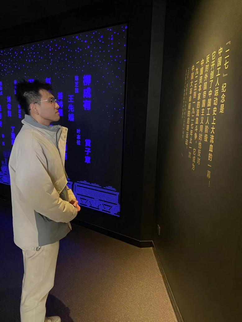 1月13日上午10时,成员苏闪闪同学在二七纪念塔七层观看全景视频,学习京汉铁路工人运动所孕育的二七精神。视频生动再现了工人们在封建军阀和外国资本家压迫下的艰苦生活,以及1923年2月4日在共产党人领导下举行的大罢工。苏闪闪认真记录要点,意识到二七精神是新时代青年应传承和弘扬的力量。