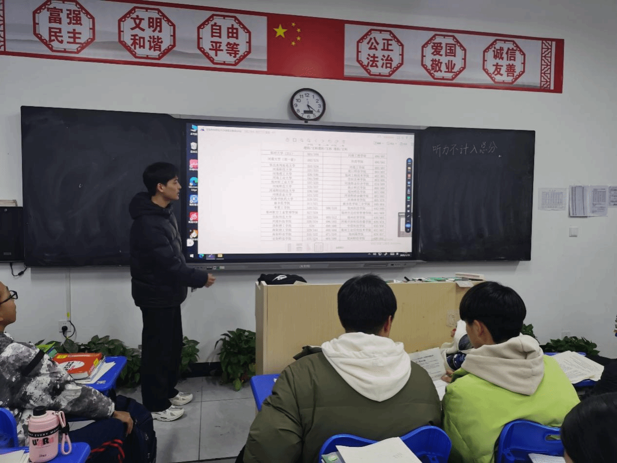 随后,宣讲团队成员们结合自身经历,分别从学习方法、专业选择、大学生活等多个方面进行了详细分享,并结合河南高校分数线指引同学们设立学习目标。队员韩梦阳同学分享了自己在高中备考时如何制定科学的学习计划,合理分配时间,提高学习效率。他特别强调了保持良好心态的重要性,并建议高中的学弟学妹们在紧张的学习之余,要适当进行运动和放松,做到劳逸结合。
