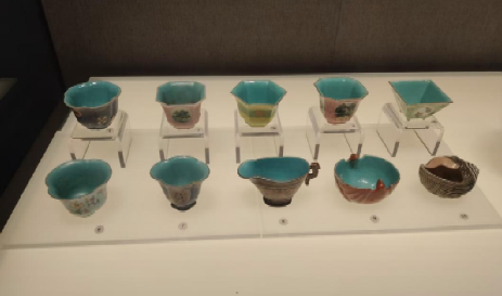这些杯盏曾盛过香茗、斟过美酒。圆润敞口杯如满月流辉,八角形杯似玲珑玉塔,方形杯则带着几分规整古雅。内壁那抹温润蓝绿,像把春日湖水藏进器物,部分杯身彩绘更是“神来之笔”:或绘花鸟,花瓣轻颤、鸟羽灵动,仿佛下一秒就要振翅啼鸣;或描人物,衣袂飘飘似要走出杯盏,把古时风雅“活”在眼前。