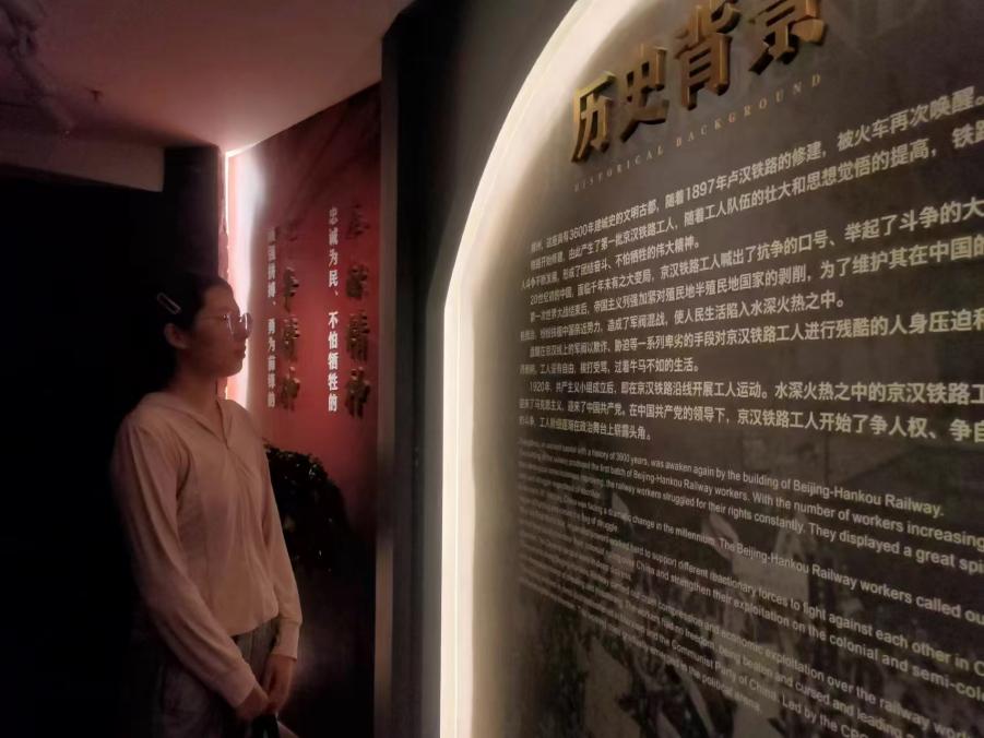 在随后的参观中,成员马晴雨对二七大罢工的社会背景产生了浓厚兴趣。她认真查看了1920年代中国工人阶级受压迫的历史图像和背景材料。展厅通过文献、图片、实物等方式,全面还原了罢工前夕工人们艰苦的生存状态及罢工发生的原因。20世纪初中国工人所遭受着压迫与剥削,工资低、工时长、缺乏最基本的安全保障。在这样恶劣的生存条件下,工人们逐渐觉醒,组织起来争取自身权利。马晴雨深受触动,她表示,正是工人阶级在艰难条件下依然团结奋起,才推动了中国革命的进程。青年人更应当铭记历史,汲取精神力量。