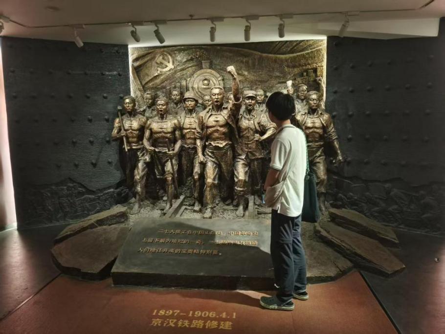 在纪念堂中央的核心展区,矗立着一座高大的雕像,生动再现了京汉铁路工人大罢工的历史场景。成员王鑫龙站在雕像前久久凝视,心中满怀敬意。这组雕塑中,罢工工人们在枪林弹雨中昂首挺立、紧握拳头,面容坚毅、身姿挺拔,体现出不屈不挠的斗争精神。王鑫龙被雕像所展现的坚强意志深深打动,他表示,这不仅仅是一段历史的记载,更是一种精神的传承,激励当代青年不忘初心、牢记使命,将个人理想融入民族复兴的伟业之中。