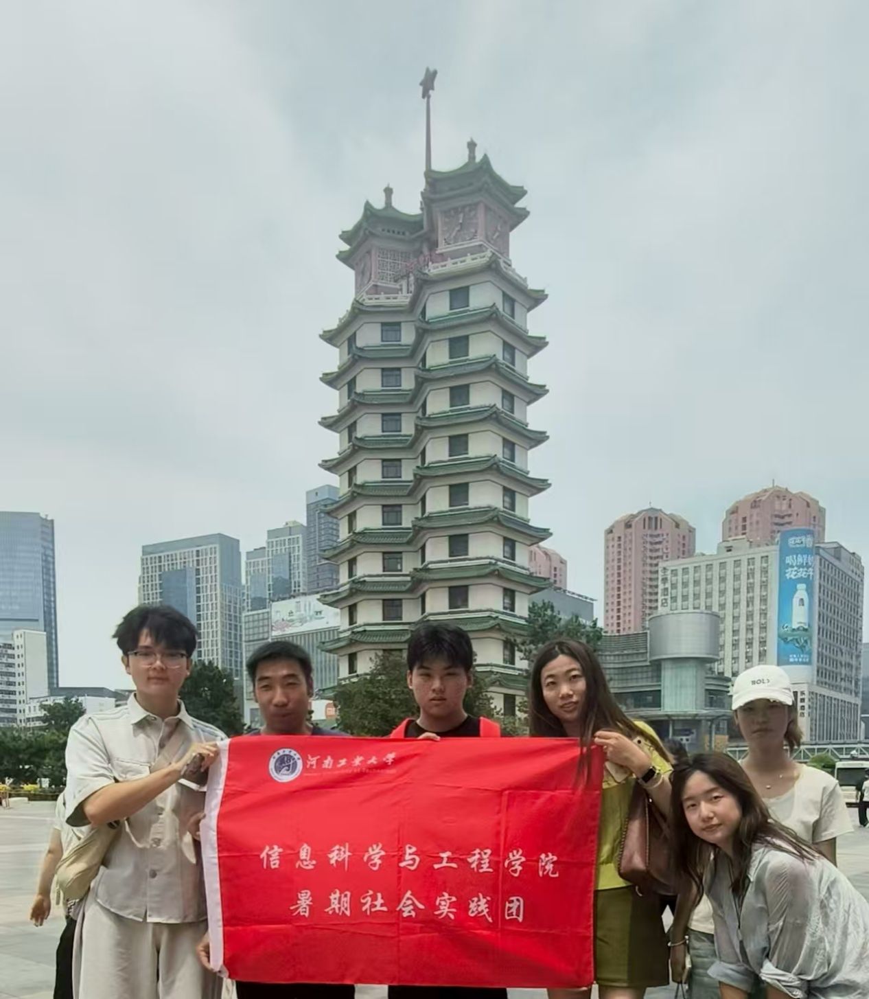 图一 星火先锋队手持院旗于二七纪念塔正门合影