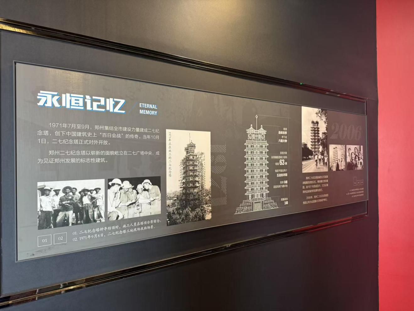 团队进去二七纪念塔进行参观,在二七纪念塔展厅有一个板块非常吸引,题目为“永恒记忆”。这个板块讲解了二七纪念塔的背景,1971 年 7 - 9 月,郑州建设者们以 “百日会战” 的拼搏,让纪念塔在二七广场拔地而起,10 月 1 日正式开放,成为郑州发展的见证者。看着展板上建设时工人合影、塔体建造场景,以及后续岁月里纪念塔的故事,仿佛能触摸到当年的火热干劲。这不仅是建筑奇迹,更是城市红色基因传承的具象,激励我们铭记历史,续写奋斗篇章。笔者着了解到通过这次社会实践活动,队员们表示增加了他们对红色革命的认知、相信他们会在今后的生活中积极参与红色活动,发扬红色精神。
