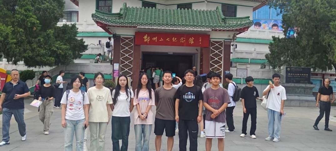 7月22日下午14时30分,实践团首先来到二七纪念堂。这座为纪念京汉铁路工人运动而建的纪念堂,以其厚重的历史底蕴和庄严的氛围深深吸引了队员们的目光。在“千秋二七”红墙前,队员们驻足凝视,那段英雄历史仿佛穿越时空,震撼着每个人的心灵。通过参观“铁路修建”“革命烈焰”等展区,队员们不仅了解了二七大罢工的历史背景,更切身感受到了二七精神中不怕牺牲、甘于奉献的精神内核,这种精神力量深深烙印在每位队员的心中。