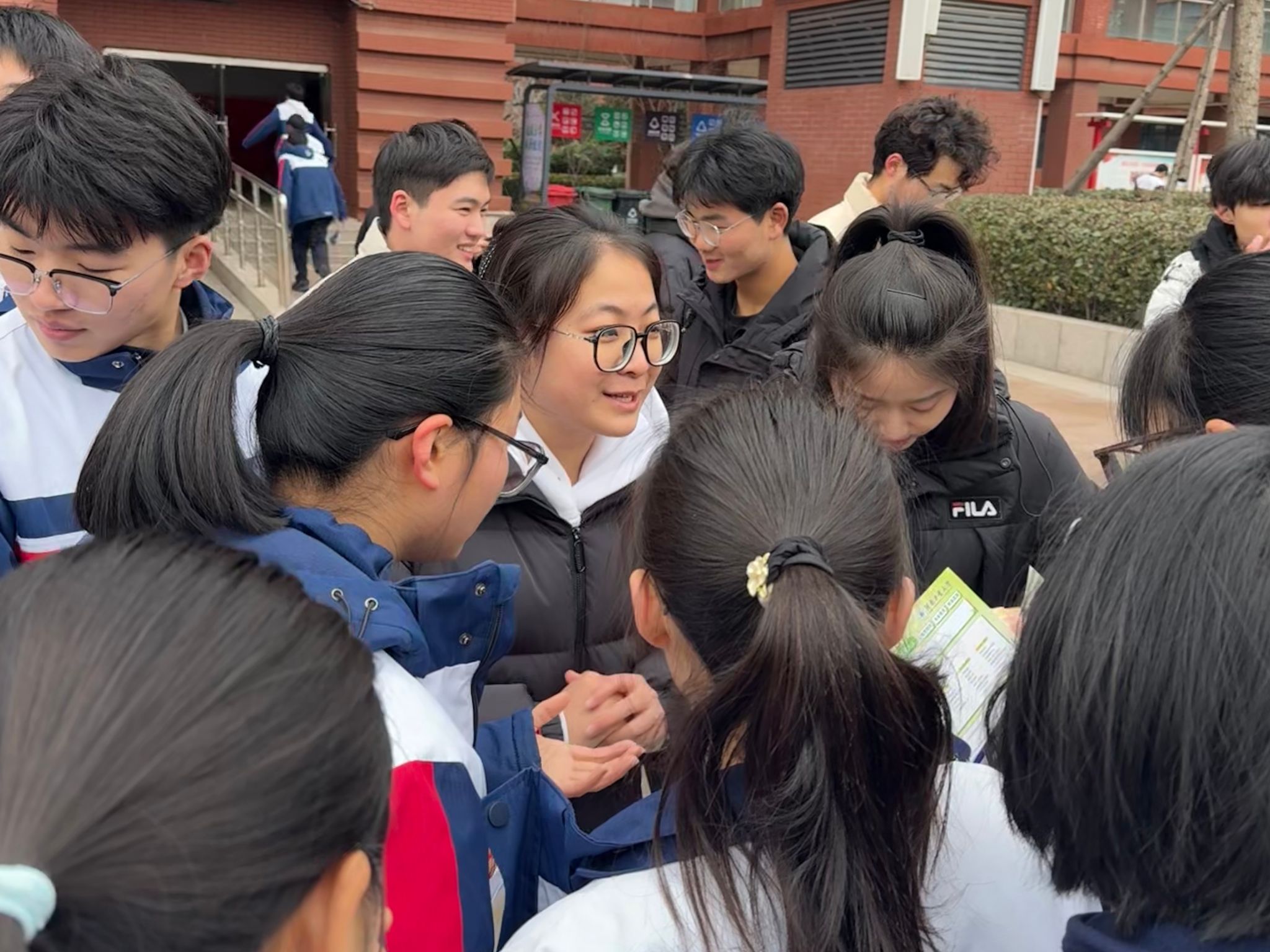 合影结束后,宣讲团迅速前往学校时代广场的指定摊位,快速摆放好提前准备的纸质宣传资料、专业介绍手册等物料,同步做好摊位宣讲的各项准备工作。随着课间休息时间到来,同学们陆续来到时代广场,宣讲摊位前很快聚集了不少咨询者。针对同学们提出的校园生活、专业选择、就业前景等问题,宣讲团成员结合自身经历逐一细致解答,用通俗易懂的语言分享高校学习与生活的真实场景,帮助同学们直观感受大学生活的魅力。