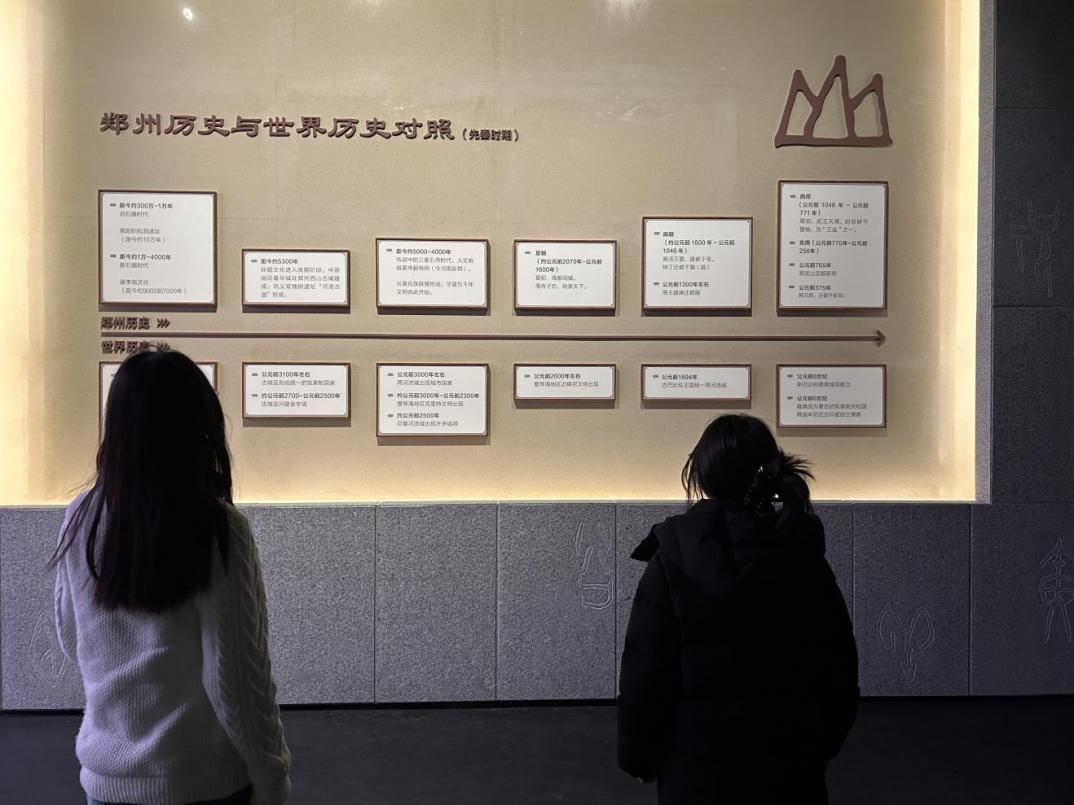 驻足于 “郑州历史与世界历史对照” 展板前,目光在中原文明与同期世界文明的时间节点间穿梭。这种横向的时空参照,展现了郑州作为华夏文明核心区在世界文明进程中的独特分量。
