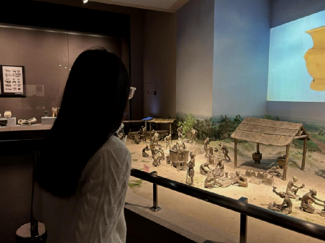 厚重的铜锈里凝结着三千年前商都的威严,鼎身繁复的纹饰无声诉说着商代的礼制与工艺,使人身临其境的场景复原展,那些形态生动的陶土小人他们围坐制陶、俯身劳作,远古生活的气息扑面而来,周围的文物一一与眼前的场景相互印证,让队员们直观感受到中原文明的起步。