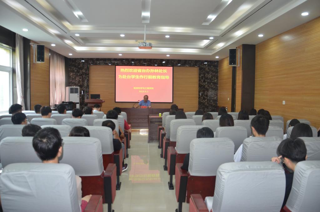学生在台交流的表现给予了肯定。随后,孙林处长对中国台湾的人文地理情况、当前的台海时局、中央对台政策以及赴台注意事项向2019年即将赴台交流的同学做了详细的讲解。并从思想、政治、生活三个方面该做的准备给同学们进行了详细的介绍。他希望此次赴台同学能体现大陆学生良好的风貌,为两岸友好往来及交流做出自己的贡献。